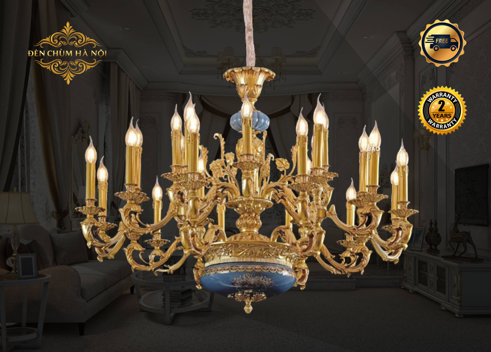 Chính sách đổi trả của Đèn Chùm Hà Nội về: Đèn Chùm Đồng Mạ Vàng Gắn Đá Xanh Hoàng Gia Tân Cổ Điển Châu Âu