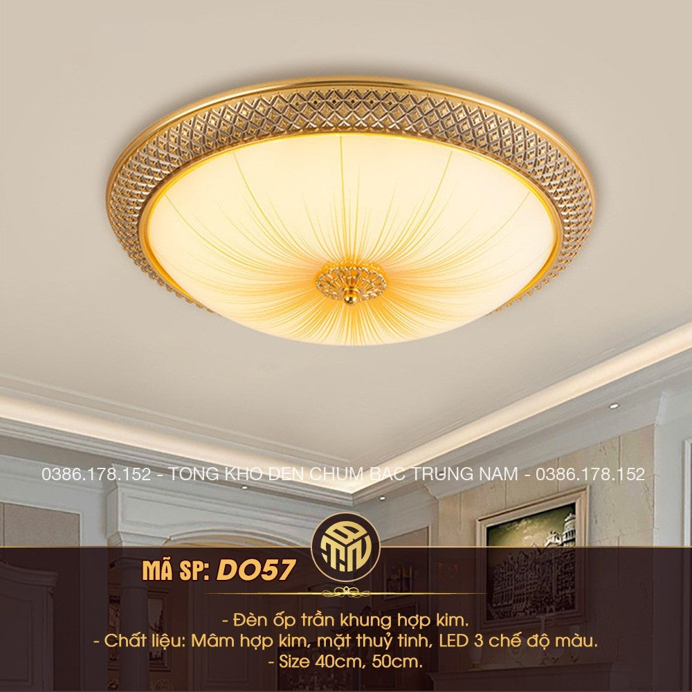 Đèn sử dụng khung hợp kim cao cấp mạ vàng, bề mặt xử lý tinh xảo, sáng bóng và bền màu theo thời gian. Phần mặt đèn bằng thủy tinh cao cấp màu trắng sữa, có hiệu ứng vân tỏa tia mềm mại giúp ánh sáng khuếch tán đều, không gây chói mắt. Bên trong tích hợp LED hiện đại (3 chế độ màu), tiết kiệm điện năng và cho tuổi thọ cao.