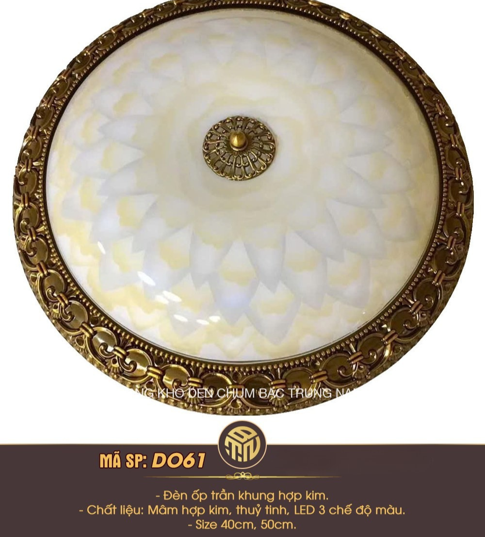 Khung viền và mâm đèn làm từ hợp kim cao cấp, đúc họa tiết nổi tinh xảo, phủ màu vàng đồng cổ tạo cảm giác sang và bền màu theo thời gian.