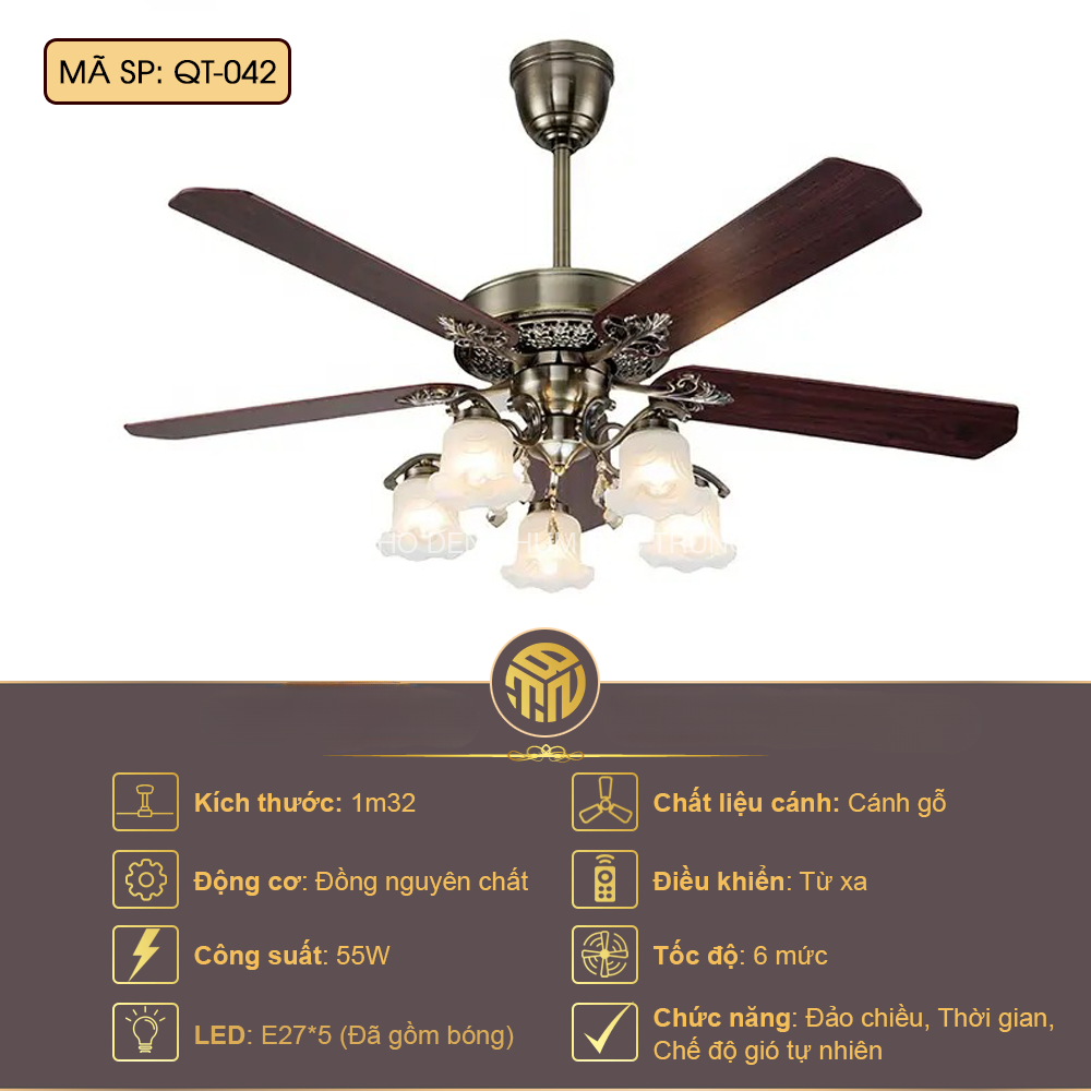 Đèn Quạt Trần Gỗ QT-042 Tân Cổ Điển – 5 Cánh Gỗ, 5 Bóng E27, Điều Khiển Từ Xa
