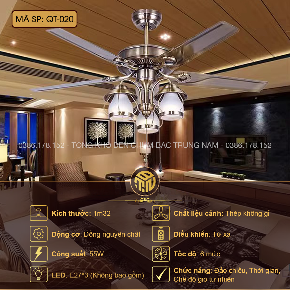 Chính sách đổi trả của Đèn Chùm Hà Nội về: Quạt Trần Đèn Trang Trí QT-020 Inox Bạc